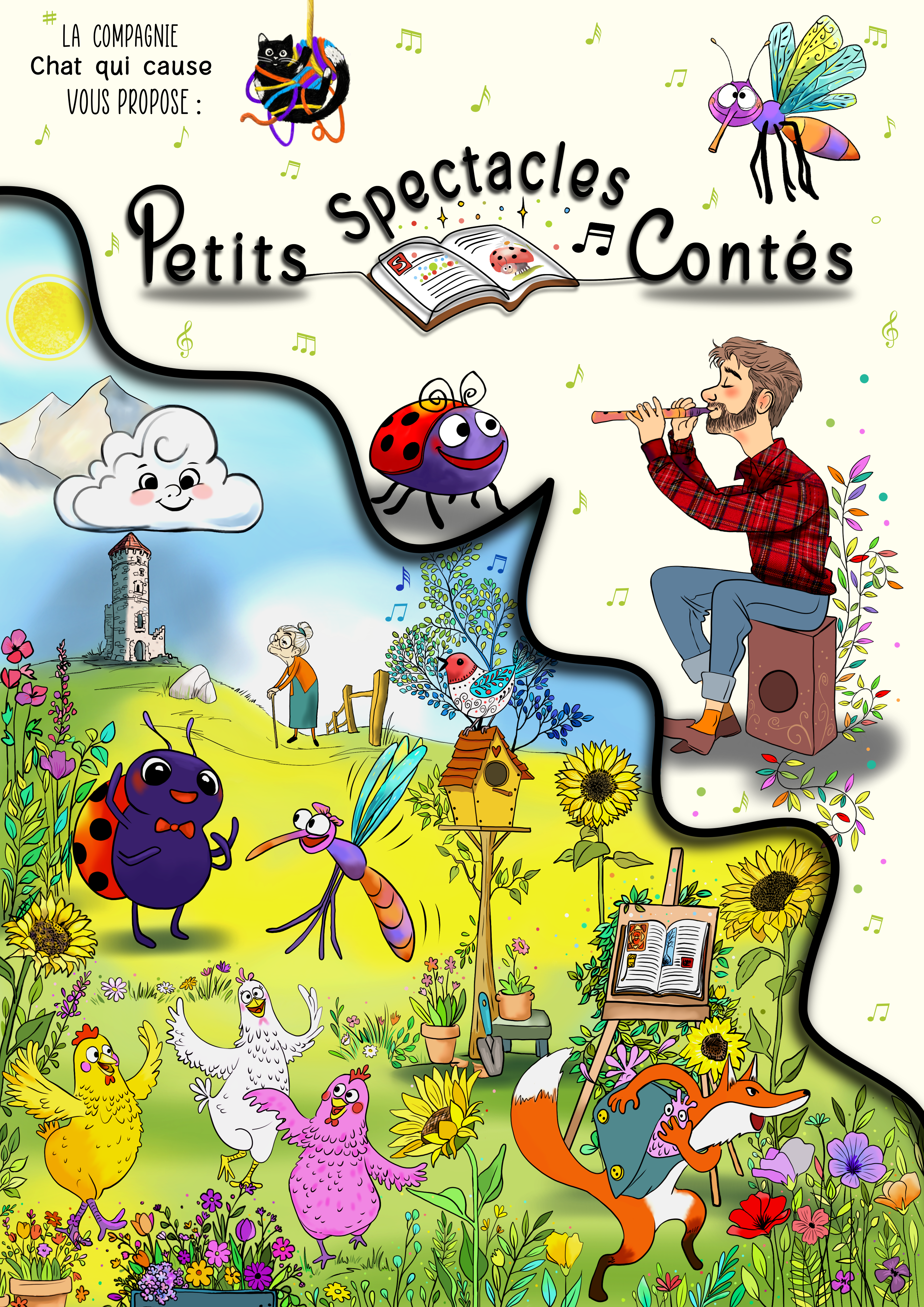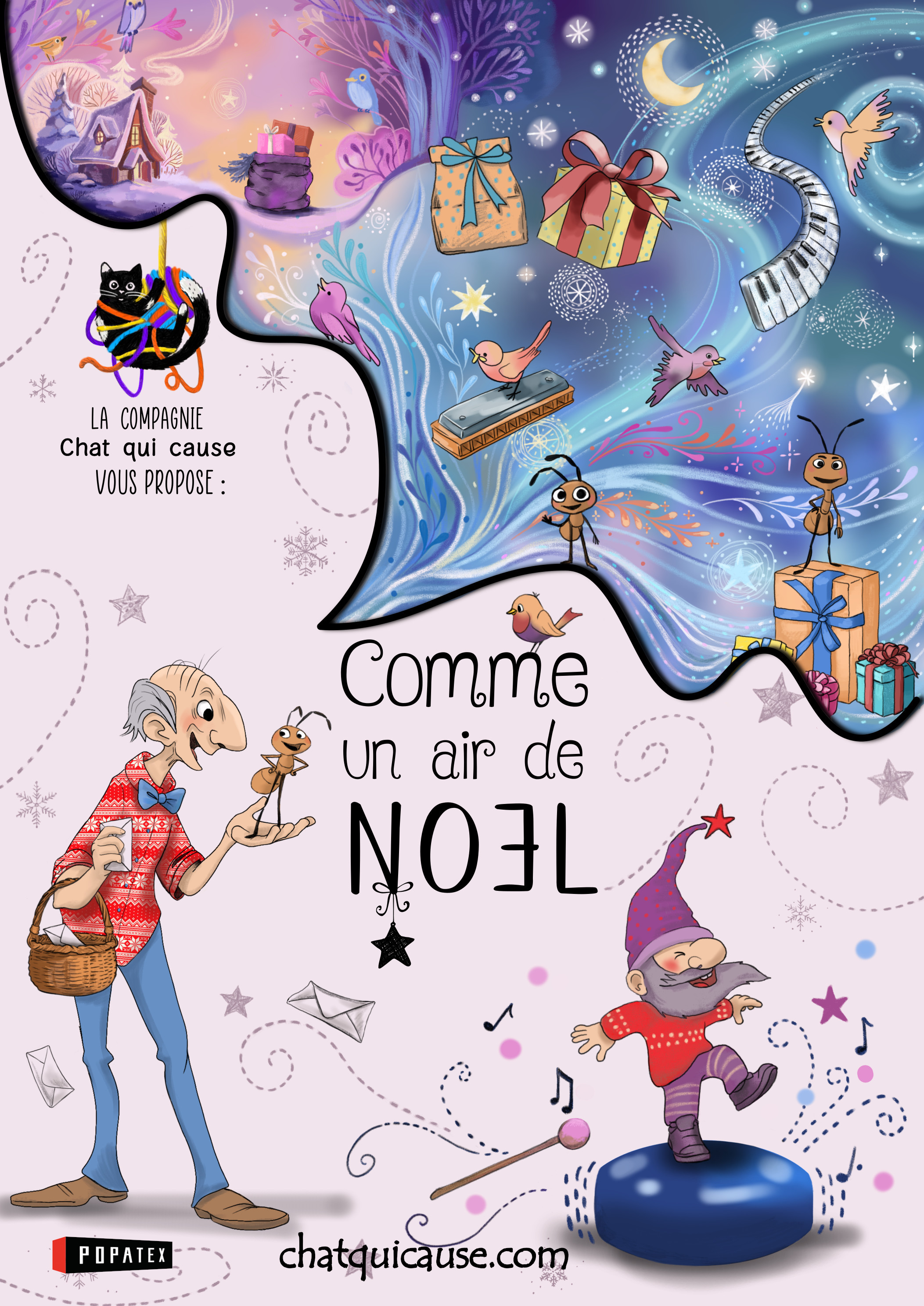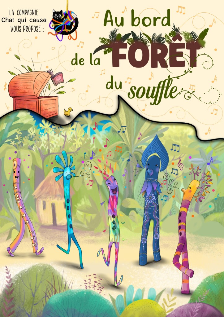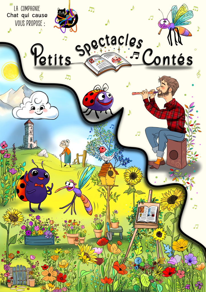 Toutes ces créations sont des œuvres originales faites entièrement par la compagnie Chat qui cause et sont jouées depuis plusieurs années maintenant. De l’histoire à la musique en passant par les décors, les éclairages et les visuels… Ce sont nos petits bébés !